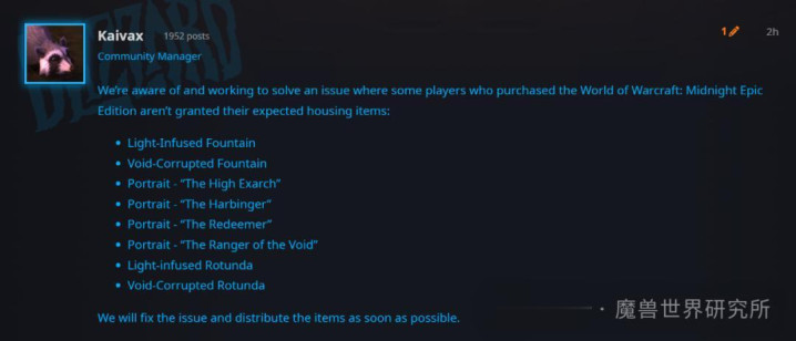我们已经注意到并正在努力解决部分购买了《魔兽世界:至暗之夜史诗版》的玩家未能获得预期房屋物品的问题: