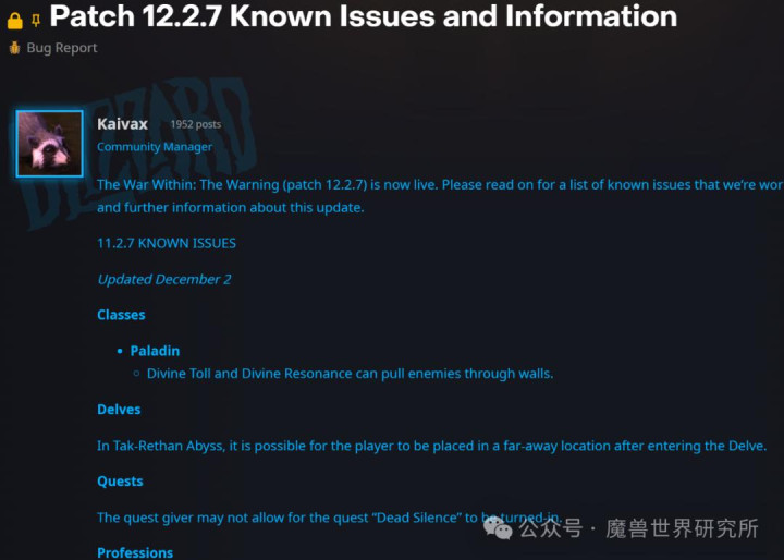按照以往的暴雪做法,一般是紧急修复,然后发布热修蓝贴,但是这次暴雪罕见的先发布了一个承认BUG问题的蓝贴,通过这篇蓝贴我们才知道,这次BUG有多离谱,圣骑变DK可以拉怪,还是隔墙拉的!
